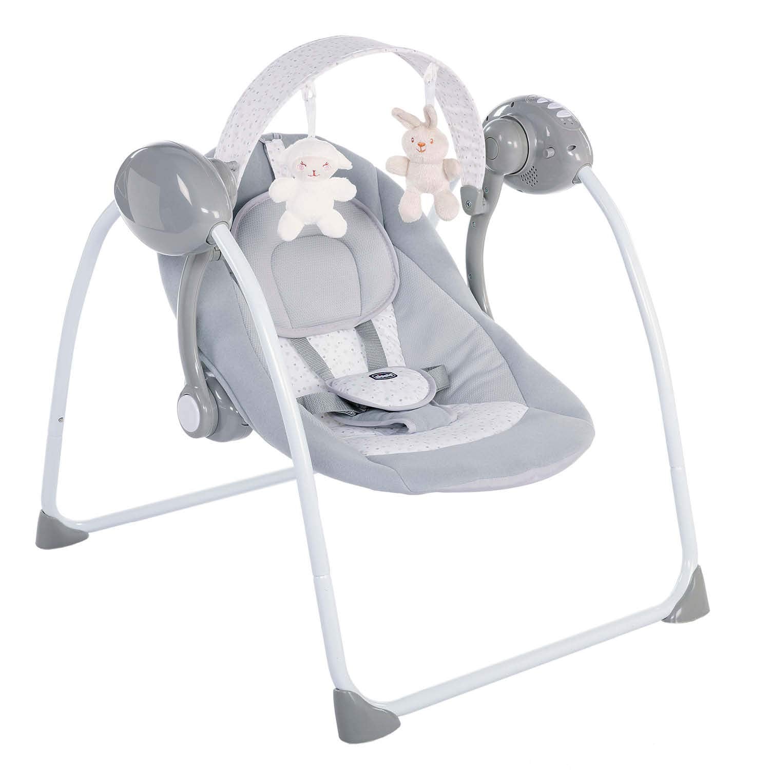 L'altalena Chicco Relax&Play, adatta dalla nascita fino ai 9 kg, è dotata di dondolio automatico con 5 diverse velocità disponibili per cullare dolcemente il bambino e aiutarlo a rilassarsi. L'altalena automatica è comoda e sicura, grazie al morbido cuscino imbottito che accoglie dolcemente il bambino e alla cintura a 3 punti che gli permette di dondolare spensieratamente. Il divertimento è garantito grazie alla barra di gioco e alla musica, con 12 melodie selezionabili e 2 peluches pendenti rimovibili. La seduta è regolabile in due posizioni con diverso grado di reclinazione per garantire un comfort e relax elevati al bambino fin dal primissimo mese di vita. Si chiude in modo semplice e compatto; una volta chiusa, sta in piedi da sola e può essere riposta e trasportata con facilità. L'imbottitura della seduta può essere facilmente rimossa e lavata in lavatrice per garantire un'igiene e una pulizia elevate. Dimensioni: 69.5 x 60 x 58.5 cm. Peso: 3 Kg.