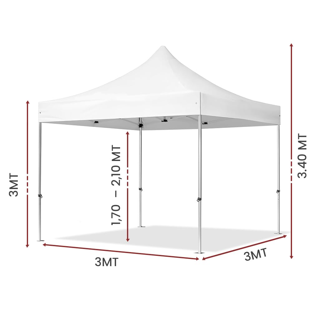 Dettagli: DIVINA GARDEN GAZEBO IN ALLUMINIO MARKET-PRO Linea gazebi professionali con struttura in alluminio esagonale. Adatti per un uso frequente e professionale nei settori horeca, ristorazione, catering ed eventi. Caratteristiche: Dimensioni: 3 x 3 mt Struttura: ALLUMINIO ESAGONALE 40/45 mm spessore 1,80 mm Regolazioni: Altezza totale min 3 mt - max 3,40 mt Altezza sotto tetto min 1,70 mt - max 2,10 mt Richiudibile a fisarmonica con ingombro minimo Telo tessuto Oxford 1680D ricoperto in PVC completamente impermeabile Velcro maggiorata sui quattro lati Il telaio pieghevole si blocca a scatto a ogni angolo Piedini in metallo pesante Aste verticali telescopiche a sezione esagonale Ogni asta è bloccabile in 5 altezze diverse Accessori: Sacca da trasporto rinforzata con cerniera 4 Borse per ancoraggio, picchetti e corde