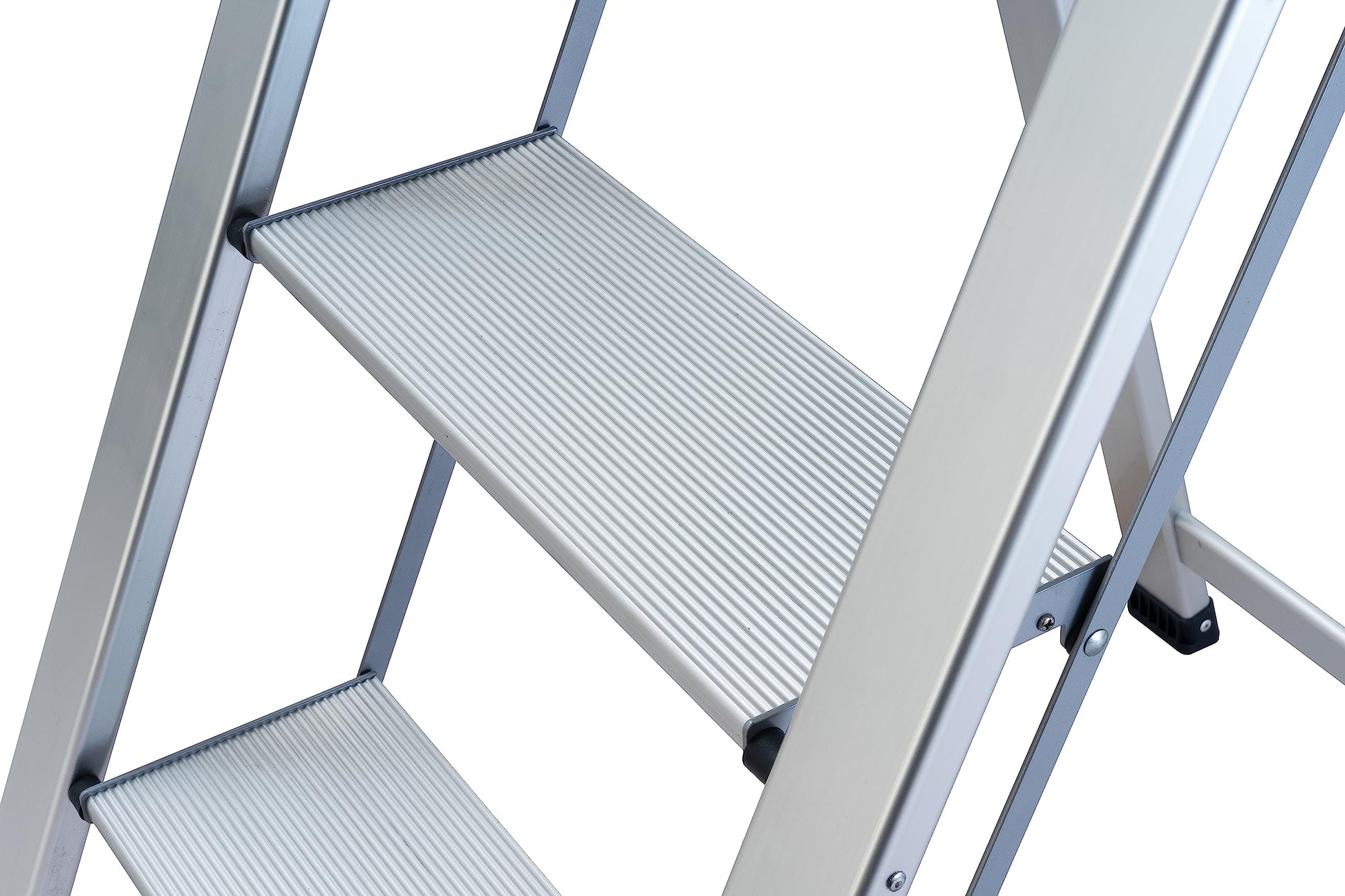 Piattina unica di collegamento tra i gradini per un'apertura e chiusura facile. Distanza dalla piattaforma alla sommità del parapetto: 600 mm. Profondità dei gradini: 130 mm. Larghezza della piattaforma: 330 mm. Minimo ingombro quando chiuso:50 mm. piedini antiscivolo zigrinati.