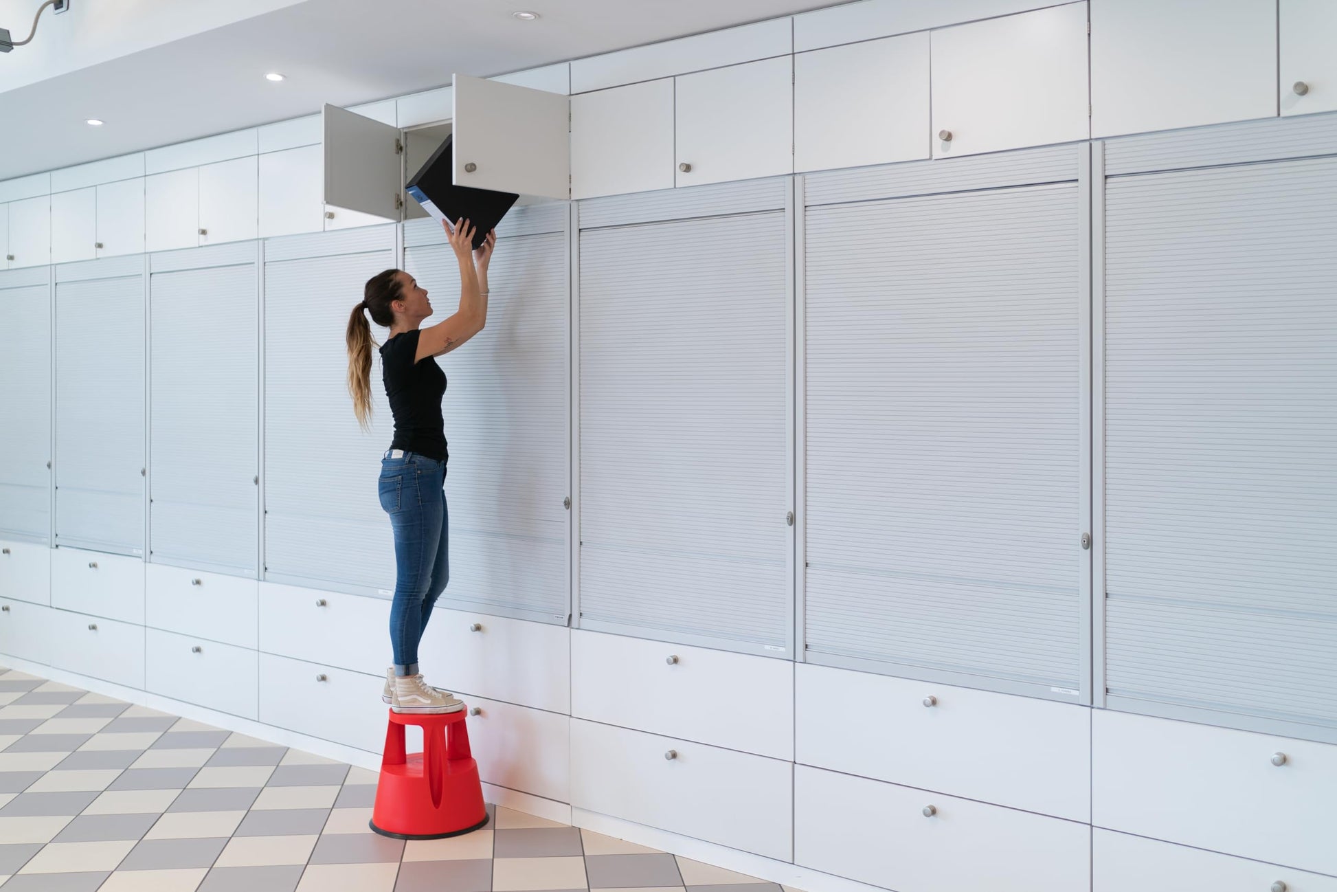 - "Rollingstep" è uno sgabello tondo in plastica, molto leggero - solo 2,2 kg - che si può spostare facilmente senza toccarlo con le mani. E' dotato di 3 ruote a molla che si bloccano quando si sale in piedi oppure quando ci si siede. E' ideale per essere utilizzato nelle librerie o nelle farmacie dietro al bancone, e in tutti quegli spazi ristretti che non consentono l'apertura di un normale sgabello. In fase di non utilizzo il suo ingombro è minimo: si può smontare in due parti, la più grande contiene l'altra. Alla base ha una membrana speciale in gomma, che impedisce lo scivolamento.