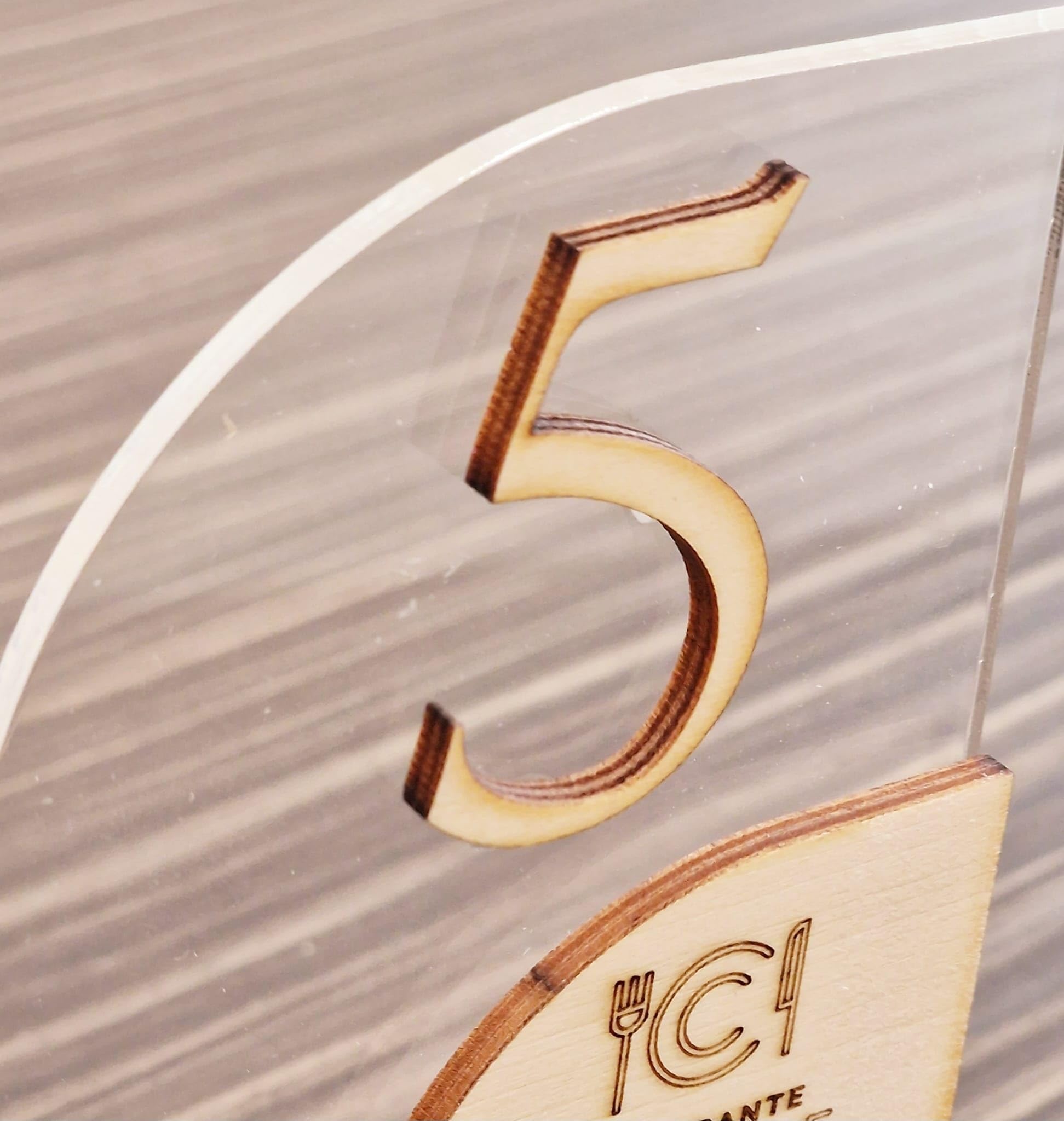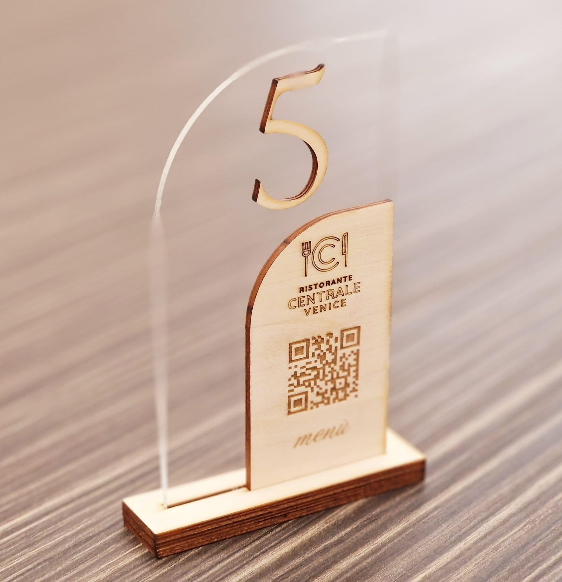 - Segnatavolo in Plexiglass e Legno per Ristorante, Pizzeria, Bar, Trattoria | Pegnaposto Numerato Personalizzato Intaglio Laser, con QR code per Menù on line e Logo Aziendale.